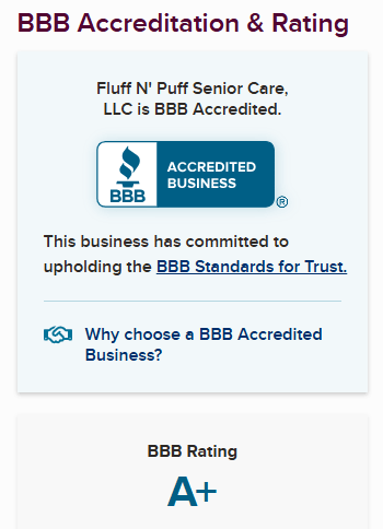 We are pleased to announce that Fluff n Puff Senior Care is now fully accredited with the Better Business Bureau!
